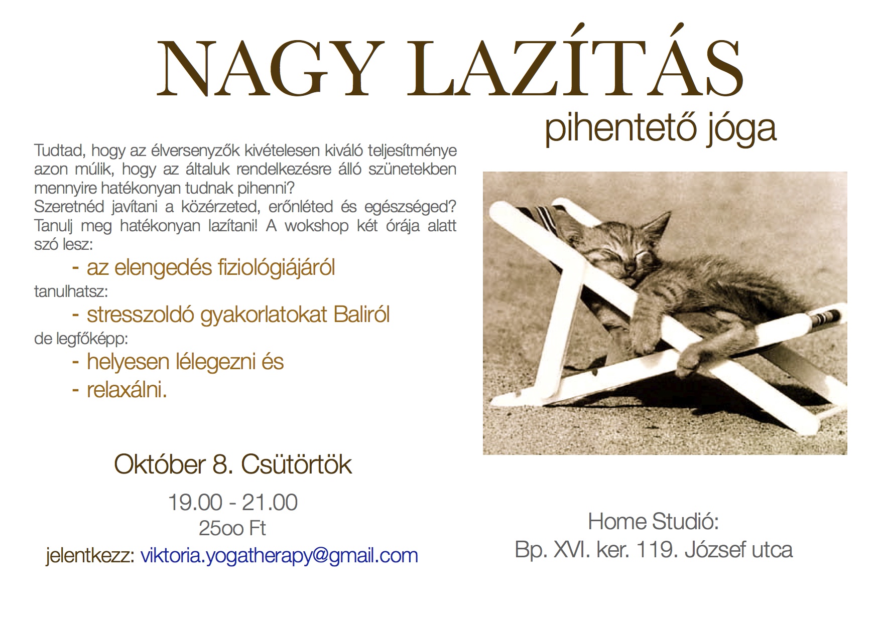Pihentető jóga September 10, 2015September 28, 2015 by Viktoria Maczo, posted in Restorative Yoga Ha úgy érzed, kicsit ki vagy merülve mostanság… Vagy csak kényeztetéd magad? Ez egy jó alkalom! Ne habozz regisztráj hamar, mert gyorsan betelnek a helyek 🙂 Namaste, Viki Share this: Click to share on X (Opens in new window) X Click to share on Facebook (Opens in new window) Facebook Like Loading...