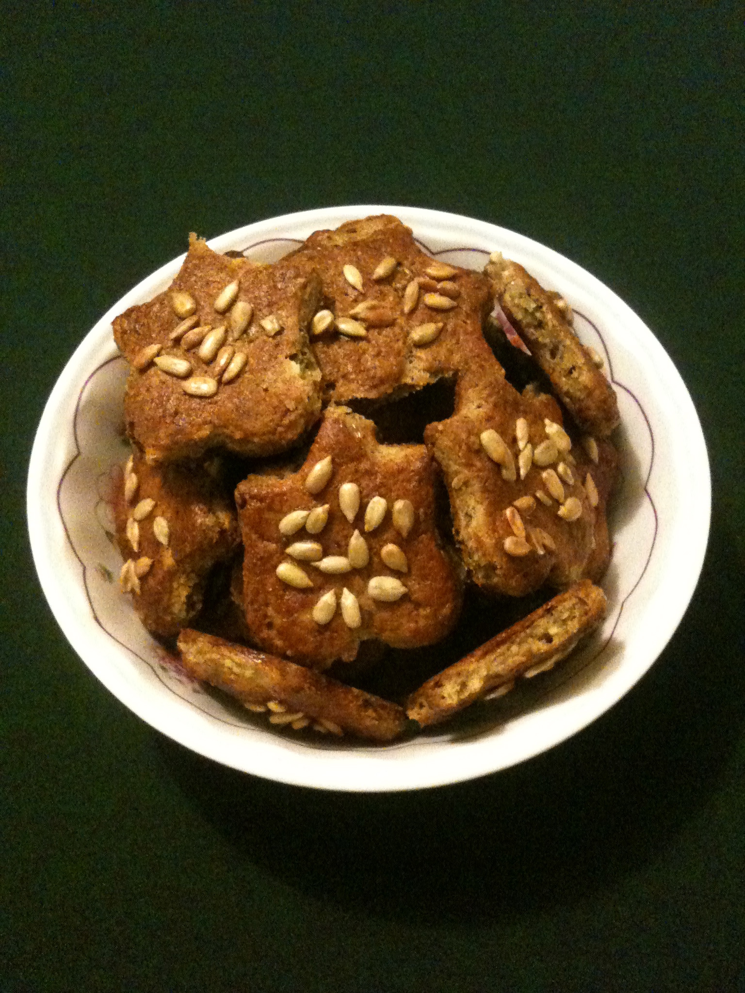 Legutóbb a tetejét napraforgó maggal díszítettem és a tésztához kevertem tökmaglisztet is! És mivel nem találtam a pogácsa szaggatóm a mézeskalás szaggatómmal formáltam, ezért hát ilyen csinos! 🙂