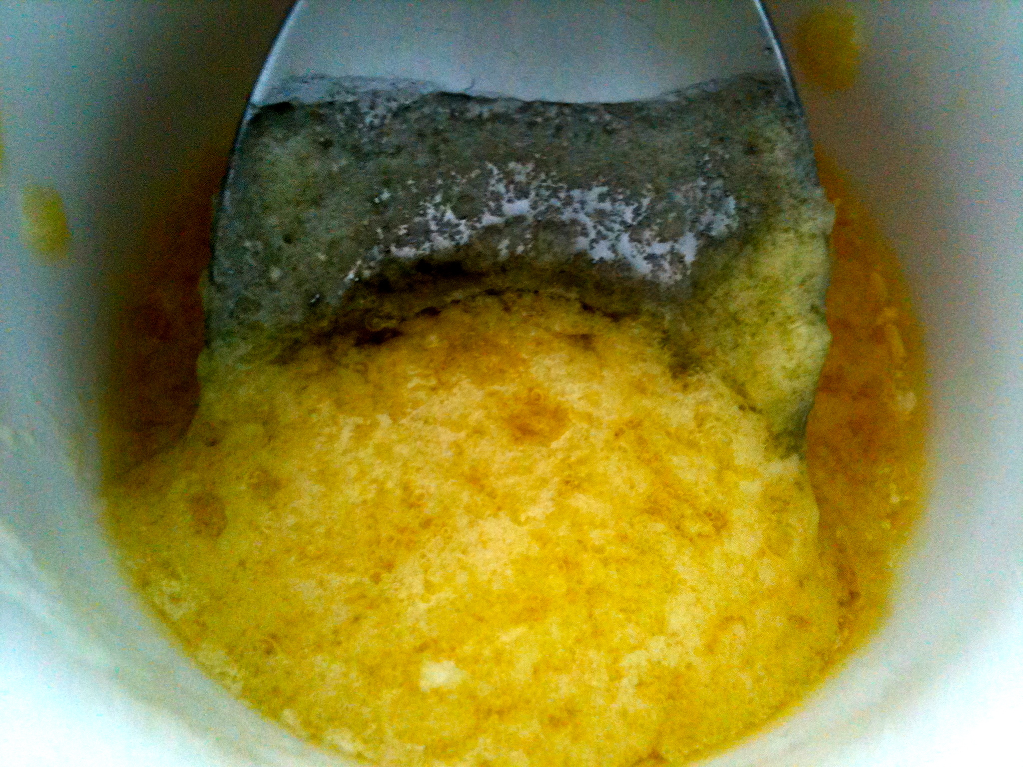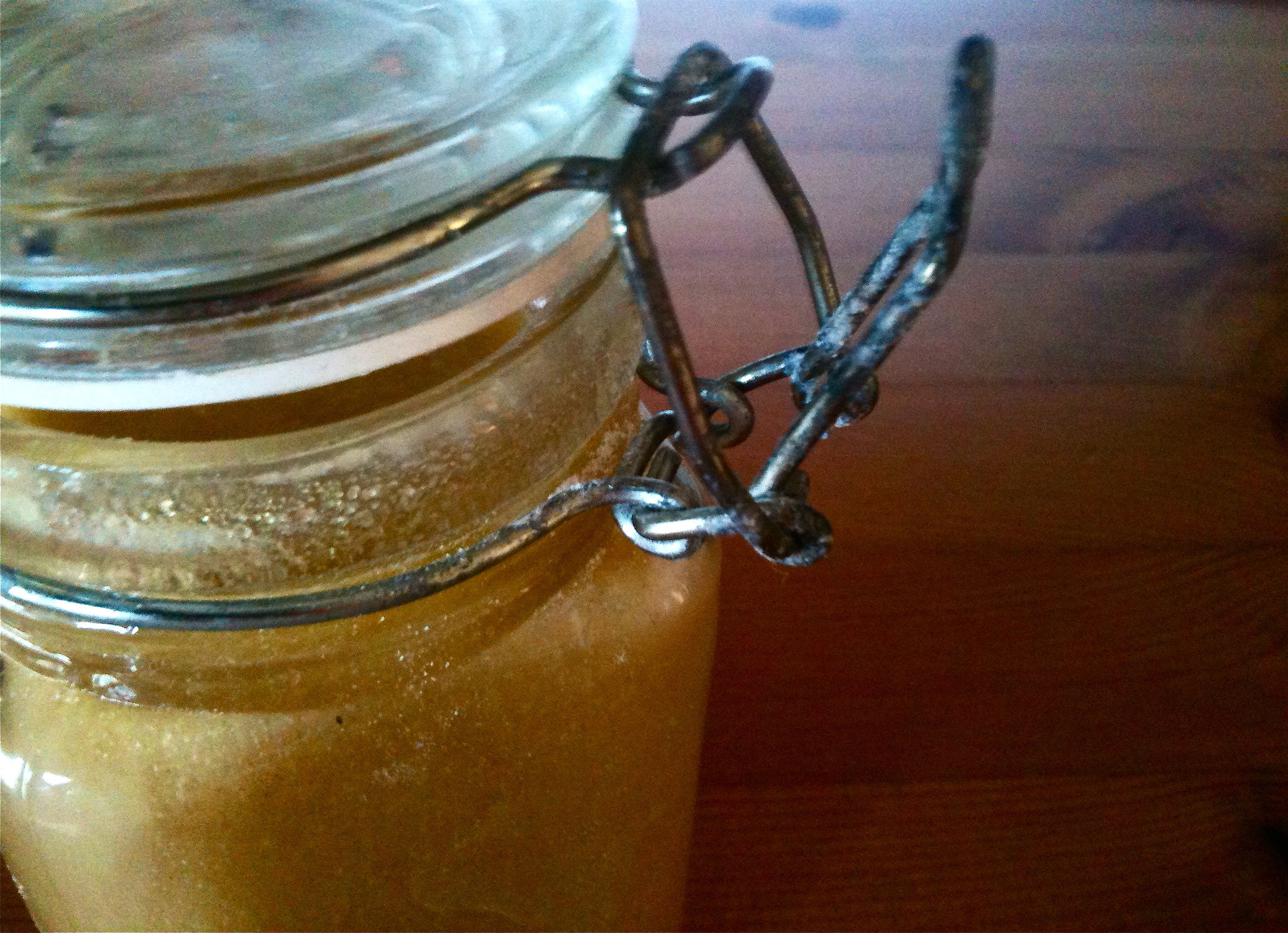 5. Let the ghee cool until just warm. Skim off and save the foam from the top because it has medicinal qualities. (It is good on hot rice!)
