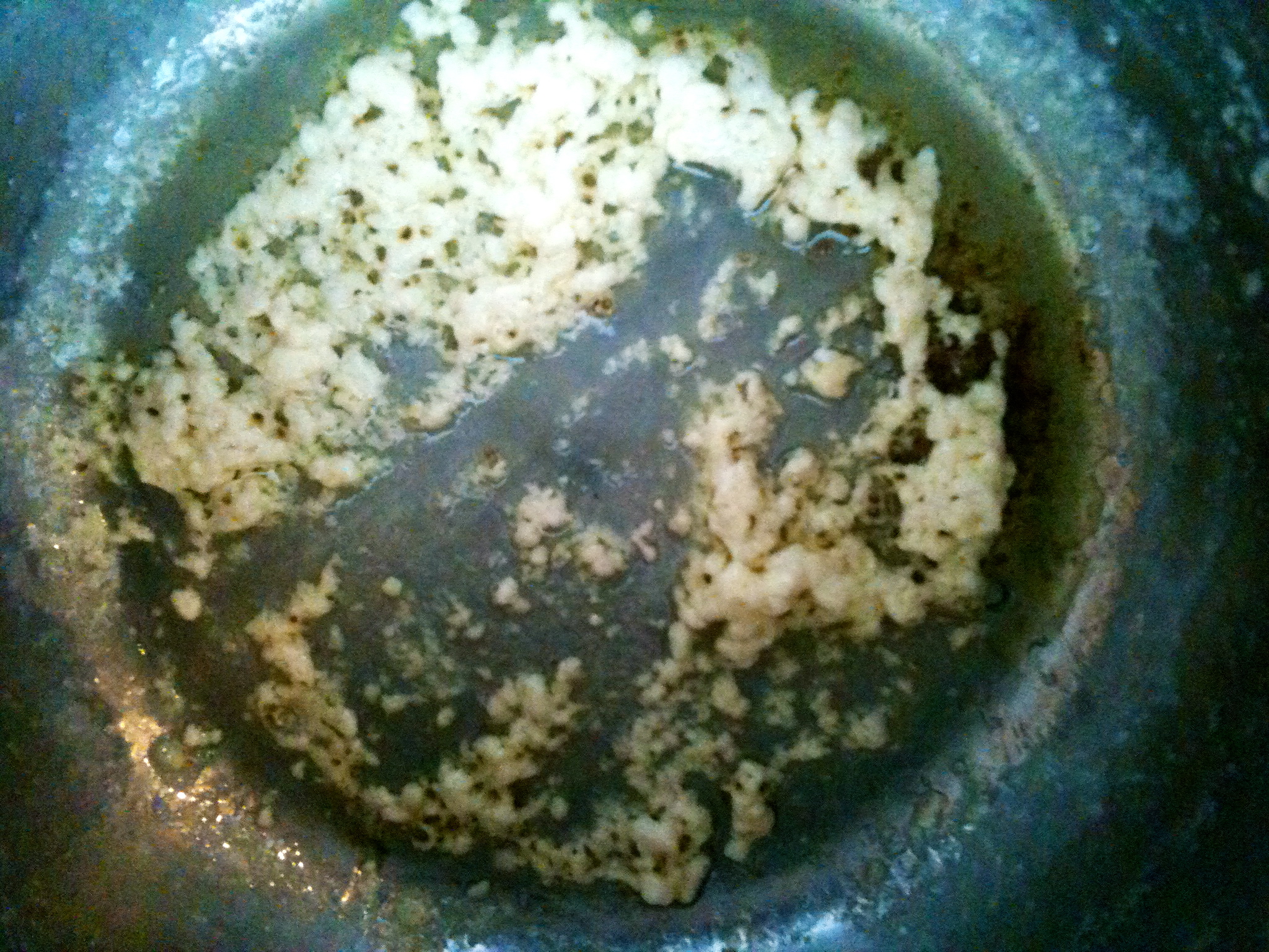While I saute the finely diced onions in coconut oil I add a little salt. When almost done I add the garlic (finely diced) and sauté a little more.