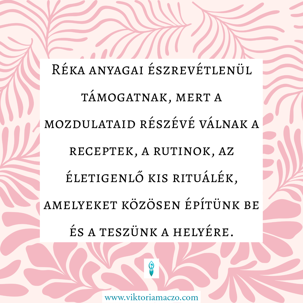 Valahogy különösen megszerettem Réka stílusát; – mint tanár, mentor, nő, asszony és Édesanya, – a dolgok mélyén rejlő összefüggéseket őszintén kutató ember – szimpatikus volt számomra. Tetszett az, ahogy gondoskodott rólunk egy finoman elkészített teával és azzal, hogy rendszeresen felhívta a figyelmünket arra, hogy legyünk magunkkal kedvesebbek. Kezdve azzal, hogy oda figyelünk a természetes igényeinkre.