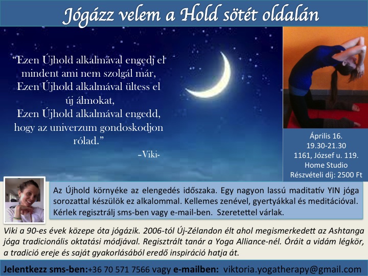 Azoknak akik itt voltak és úgy tetszett, és azoknak akik kihagyták egy újabb Hold Jógát tartok, április 16.-án. Kezdés: 19.30 és kb. 21.30-ig tart. Ezúttal Yin stílusban gyakorlunk, amit lágy, meditatív mozgás, és hosszabb ászana kitartás jellemez.